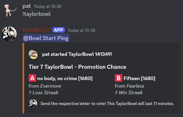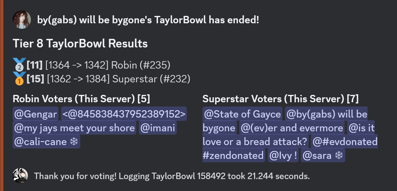At the end of every TaylorBowl, BowlBot sends a summary message of the Bowl, which includes the number of votes for both options and the votes of each member in the server; the change in Elo of both tracks; and the TaylorBowl number and time to log.